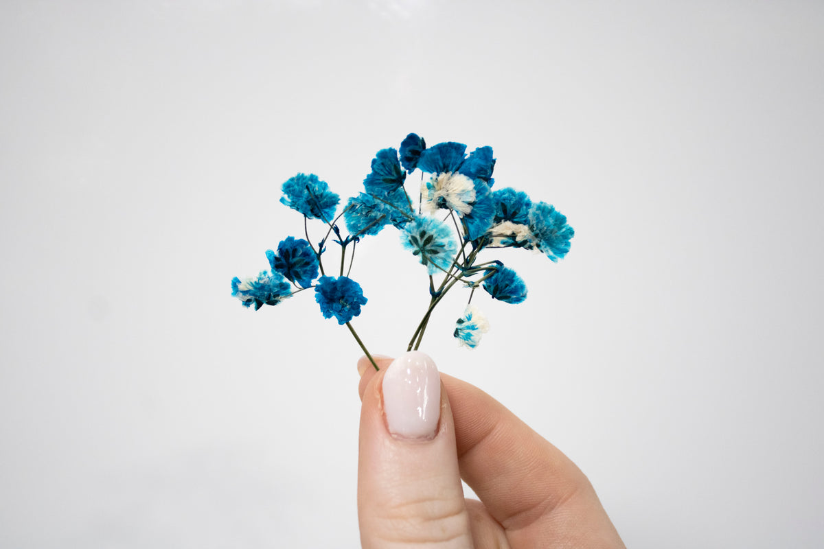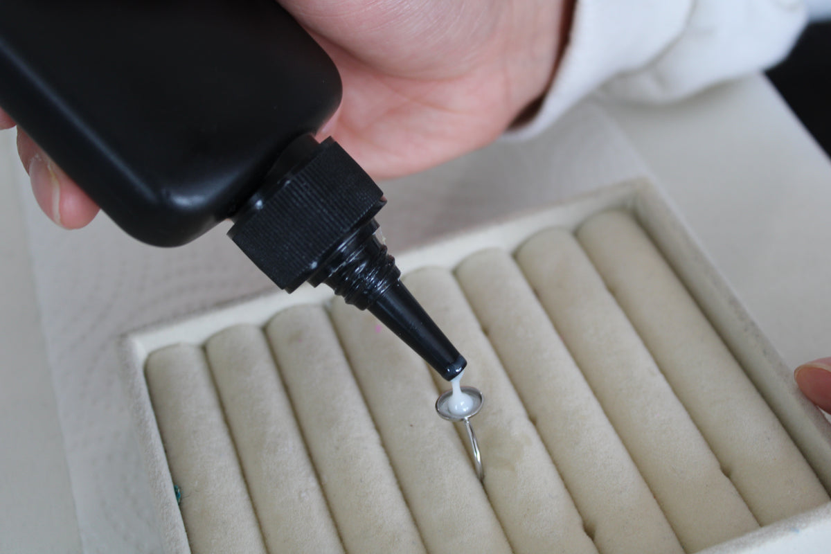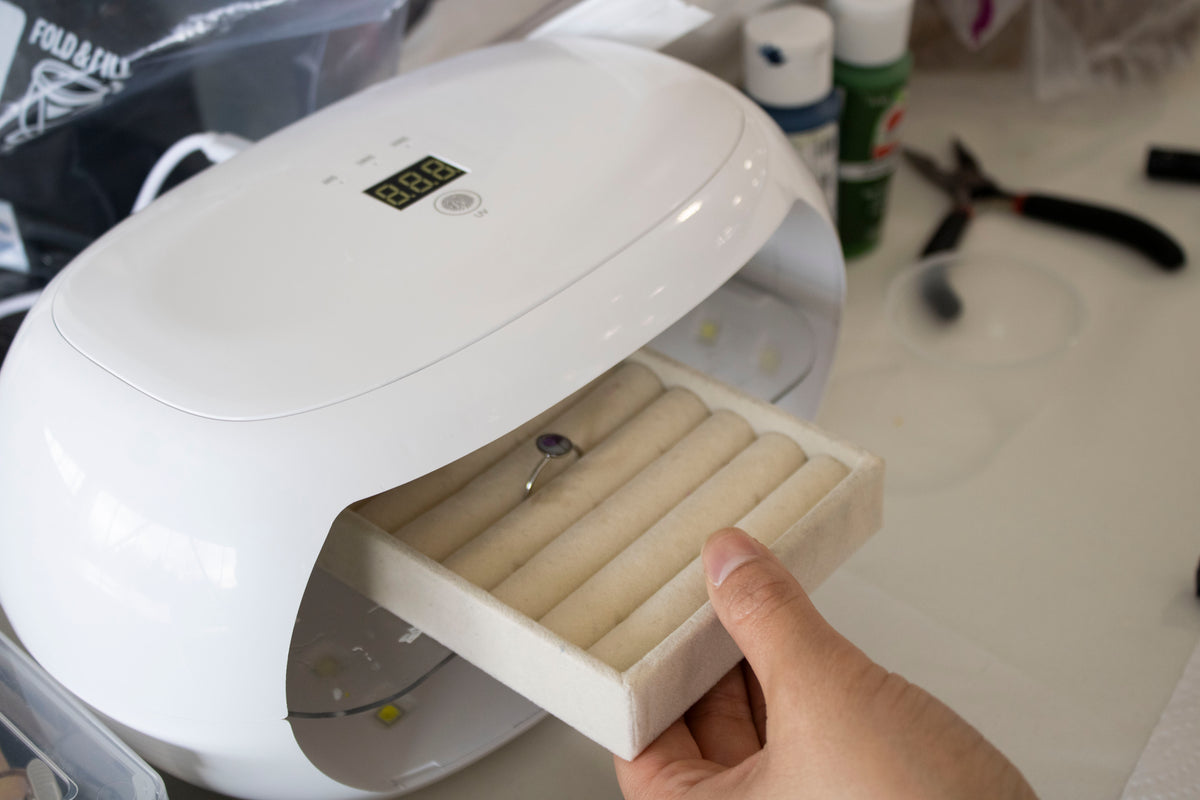 Almost done! A smooth layer of resin goes on top to seal your flower in place, and then it takes a quick trip under the UV light to cure and shine bright.